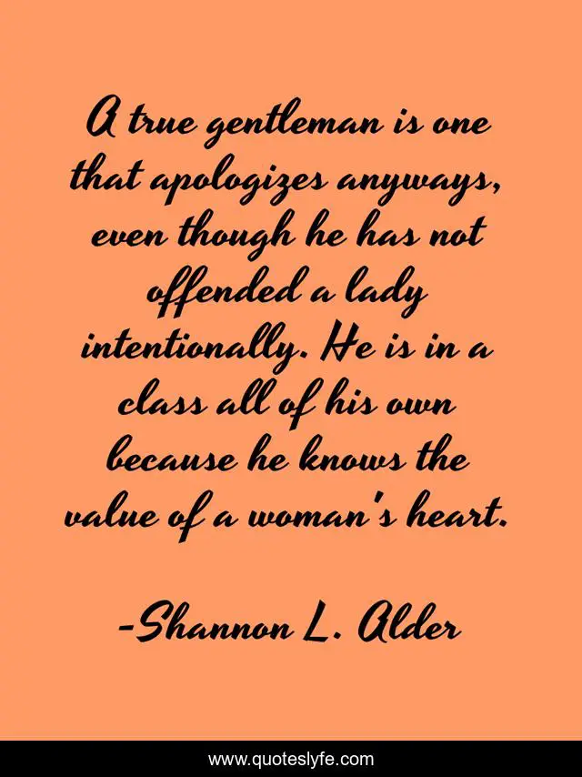 This page presents the quote "A true gentleman is one that apologizes anyways, even though he has not offended a lady intentionally. He is in a class all of his own because he knows the value of a woman's heart.". Author of this quote is Shannon L. Alder. This quote is about ladies, love, mixed-signals, manners, respecting-women, manning-up, respect, relationships, cheating,.