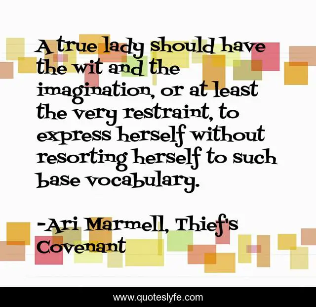 This page presents the quote "A true lady should have the wit and the imagination, or at least the very restraint, to express herself without resorting herself to such base vocabulary.". Author of this quote is Ari Marmell, Thief's Covenant. This quote is about language, lady, vocabulary, words,.
