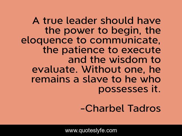 This page presents the quote "A true leader should have the power to begin, the eloquence to communicate, the patience to execute and the wisdom to evaluate. Without one, he remains a slave to he who possesses it.". Author of this quote is Charbel Tadros. This quote is about power, communication, wisdom, patience, leadership, true-leader, leader,.