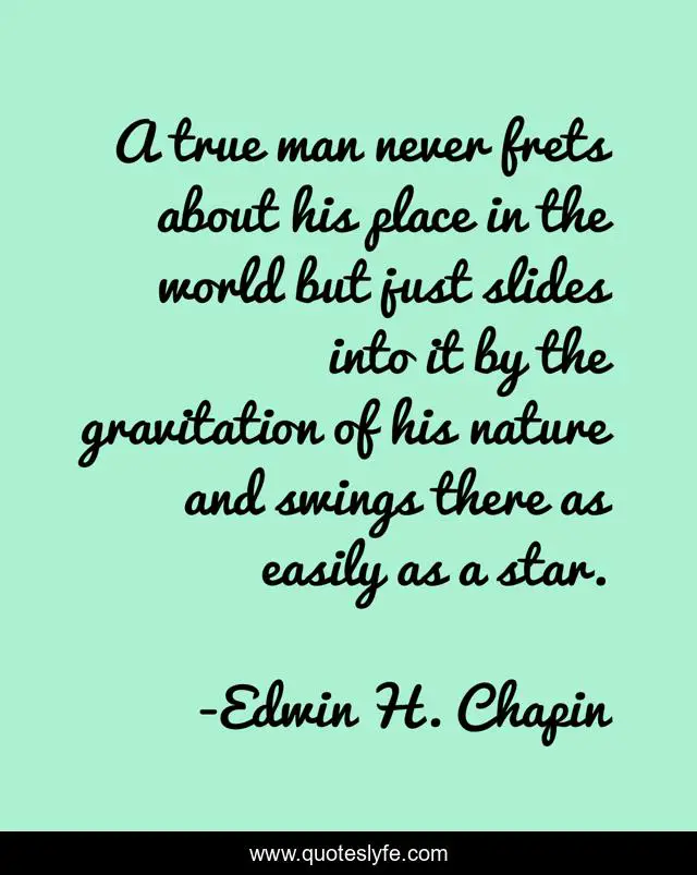 This page presents the quote "A true man never frets about his place in the world but just slides into it by the gravitation of his nature and swings there as easily as a star.". Author of this quote is Edwin H. Chapin. This quote is about self, acceptance,.