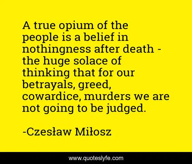 This page presents the quote "A true opium of the people is a belief in nothingness after death - the huge solace of thinking that for our betrayals, greed, cowardice, murders we are not going to be judged.". Author of this quote is Czesław Miłosz. .