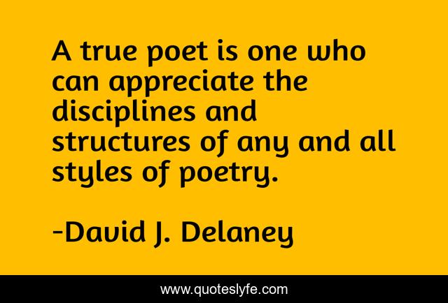 This page presents the quote "A true poet is one who can appreciate the disciplines and structures of any and all styles of poetry.". Author of this quote is David J. Delaney. This quote is about poets, poetry,.