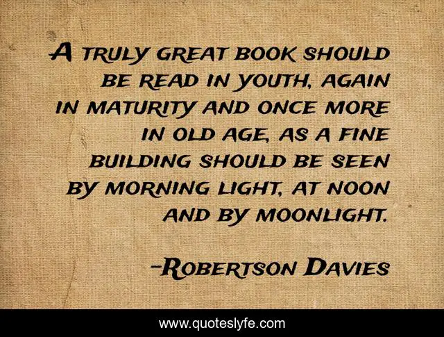 This page presents the quote "A truly great book should be read in youth, again in maturity and once more in old age, as a fine building should be seen by morning light, at noon and by moonlight.". Author of this quote is Robertson Davies. This quote is about rereading, reading, books, architecture, perspective,.