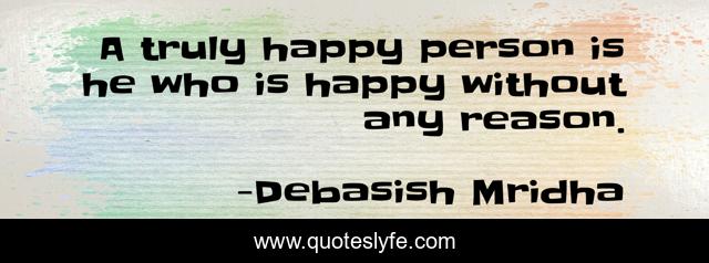 This page presents the quote "A truly happy person is he who is happy without any reason.". Author of this quote is Debasish Mridha. This quote is about philosophy, debasish-mridha, how-to-be-happy, quotes, inspirational, happy-person, enthusiasm, debasish-mridha-m-d, happiness,.