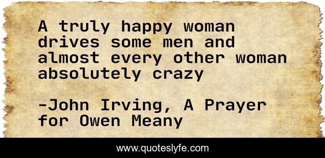 This page presents the quote "A truly happy woman drives some men and almost every other woman absolutely crazy". Author of this quote is John Irving, A Prayer for Owen Meany. This quote is about crazy, woman, happiness, women,.