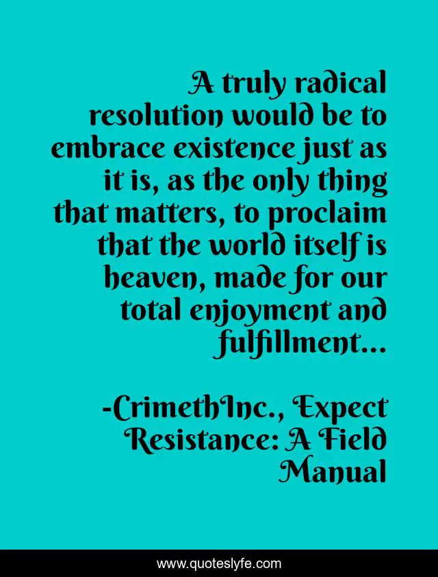 This page presents the quote "A truly radical resolution would be to embrace existence just as it is, as the only thing that matters, to proclaim that the world itself is heaven, made for our total enjoyment and fulfillment...". Author of this quote is CrimethInc., Expect Resistance: A Field Manual. This quote is about enthusiasm, life, happiness, inspirational,.