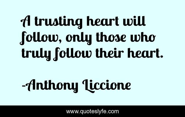 This page presents the quote "A trusting heart will follow, only those who truly follow their heart.". Author of this quote is Anthony Liccione. This quote is about heart, love, strength-of-character, loyalty, truth, dedication, trust, affection,.