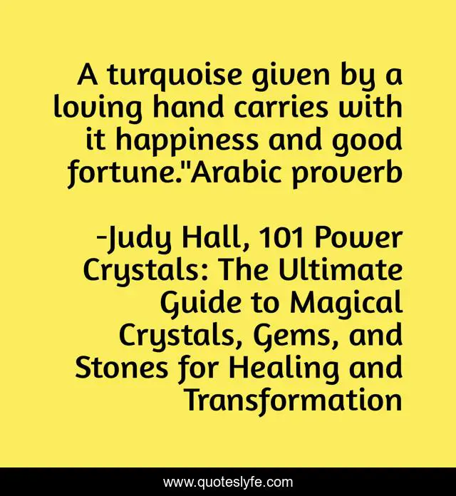 This page presents the quote "A turquoise given by a loving hand carries with it happiness and good fortune."Arabic proverb". Author of this quote is Judy Hall, 101 Power Crystals: The Ultimate Guide to Magical Crystals, Gems, and Stones for Healing and Transformation. This quote is about crystals, turquoise, healing, proverbs,.
