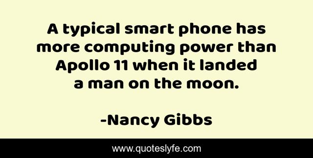 This page presents the quote "A typical smart phone has more computing power than Apollo 11 when it landed a man on the moon.". Author of this quote is Nancy Gibbs. This quote is about man, smart, moon,.