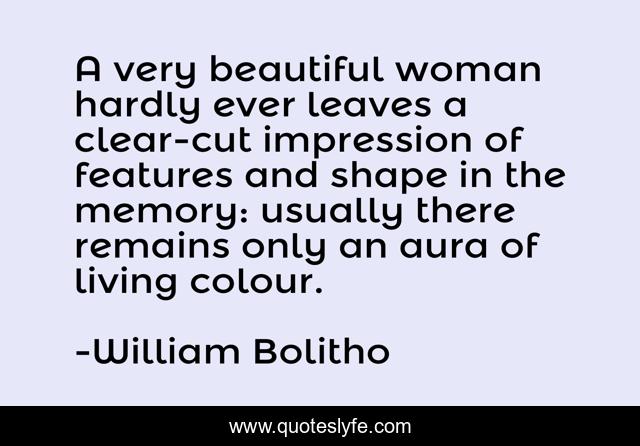 This page presents the quote "A very beautiful woman hardly ever leaves a clear-cut impression of features and shape in the memory: usually there remains only an aura of living colour.". Author of this quote is William Bolitho. .