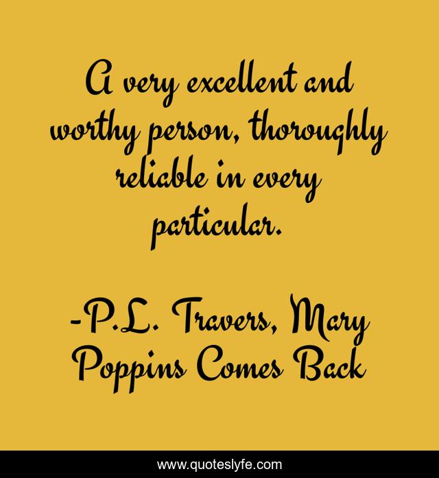 This page presents the quote "A very excellent and worthy person, thoroughly reliable in every particular.". Author of this quote is P.L. Travers, Mary Poppins Comes Back. This quote is about person, excellent-people, excellent, reliable, worthy,.