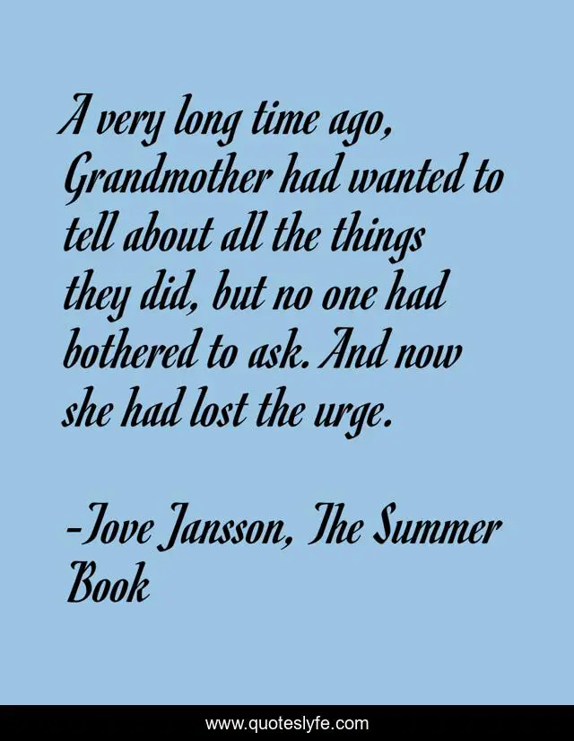 This page presents the quote "A very long time ago, Grandmother had wanted to tell about all the things they did, but no one had bothered to ask. And now she had lost the urge.". Author of this quote is Tove Jansson, The Summer Book. This quote is about forgotten-memories, age,.