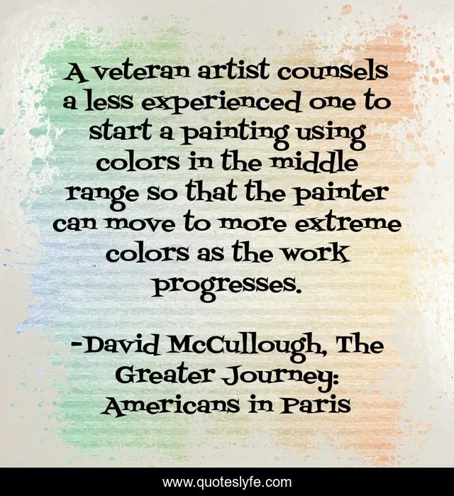 This page presents the quote "A veteran artist counsels a less experienced one to start a painting using colors in the middle range so that the painter can move to more extreme colors as the work progresses.". Author of this quote is David McCullough, The Greater Journey: Americans in Paris. This quote is about moderation, self-discipline, emotions,.