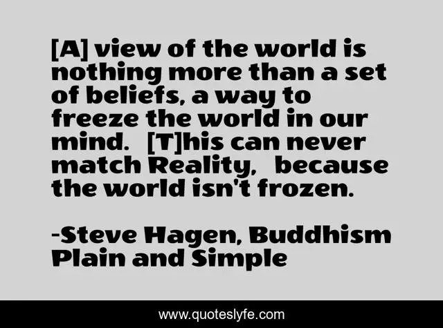 This page presents the quote "[A] view of the world is nothing more than a set of beliefs, a way to freeze the world in our mind. … [T]his can never match Reality, … because the world isn't frozen.". Author of this quote is Steve Hagen, Buddhism Plain and Simple. This quote is about zen, zen-buddhism,.