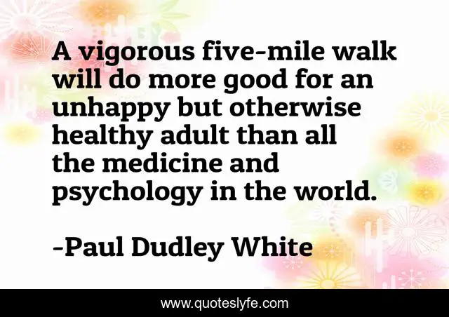 This page presents the quote "A vigorous five-mile walk will do more good for an unhappy but otherwise healthy adult than all the medicine and psychology in the world.". Author of this quote is Paul Dudley White. This quote is about medicine, sickness,.
