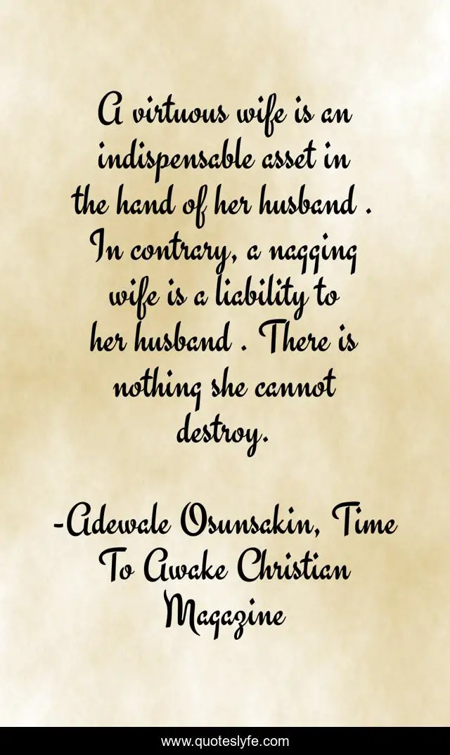 This page presents the quote "A virtuous wife is an indispensable asset in the hand of her husband . In contrary, a nagging wife is a liability to her husband . There is nothing she cannot destroy.". Author of this quote is Adewale Osunsakin, Time To Awake Christian Magazine. This quote is about family, relationship,.
