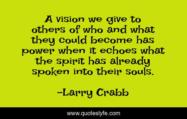 This page presents the quote "A vision we give to others of who and what they could become has power when it echoes what the spirit has already spoken into their souls.". Author of this quote is Larry Crabb. This quote is about leadership, vision,.