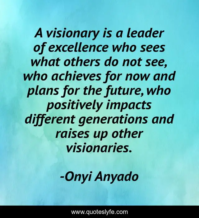 This page presents the quote "A visionary is a leader of excellence who sees what others do not see, who achieves for now and plans for the future, who positively impacts different generations and raises up other visionaries.". Author of this quote is Onyi Anyado. This quote is about visionary-leader, leadership-development, visionary, legacy, excellence, leadership-characteristics, leadership, distinction, thought-leader,.