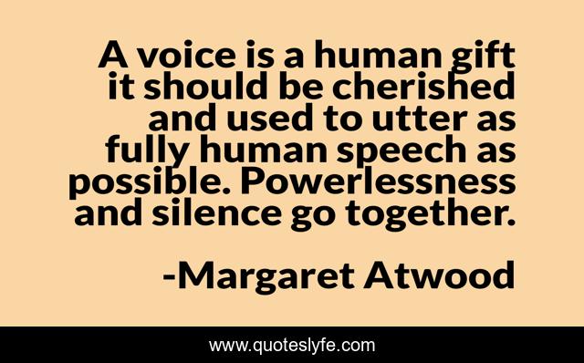 This page presents the quote "A voice is a human gift it should be cherished and used to utter as fully human speech as possible. Powerlessness and silence go together.". Author of this quote is Margaret Atwood. This quote is about positive, confidence,.