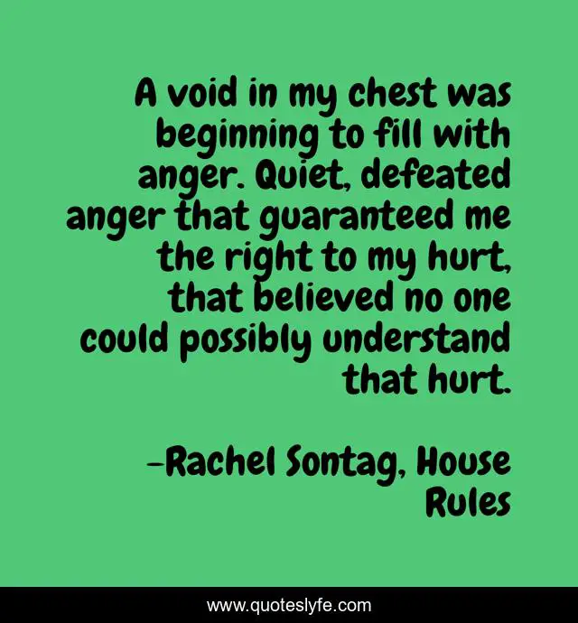 This page presents the quote "A void in my chest was beginning to fill with anger. Quiet, defeated anger that guaranteed me the right to my hurt, that believed no one could possibly understand that hurt.". Author of this quote is Rachel Sontag, House Rules. This quote is about pain, void, hurt, sadness, anger, sad,.
