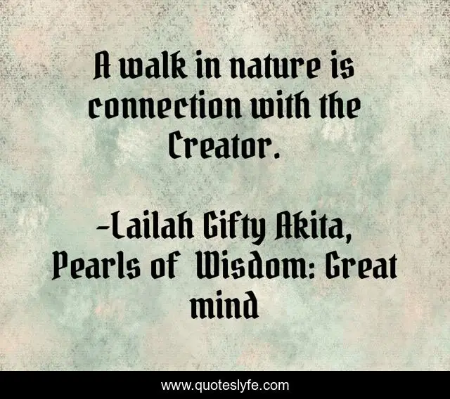 "Lailah Gifty Akita, Pearls of Wisdom: Great mind Quotes." Quoteslyfe.com, 2025. Fri. 05 Dec. 2025. <https://www.quoteslyfe.com/quote/A-walk-in-nature-is-connection-with-72945>.