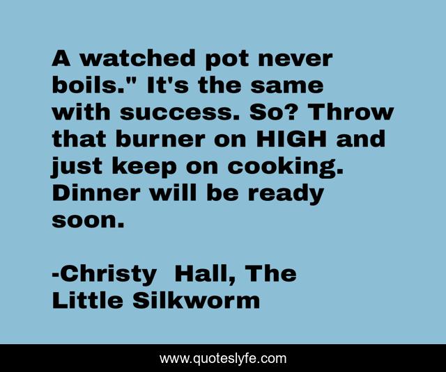 This page presents the quote "A watched pot never boils." It's the same with success. So? Throw that burner on HIGH and just keep on cooking. Dinner will be ready soon.". Author of this quote is Christy Hall, The Little Silkworm. This quote is about enthusiasm, writing, inspirational, success, writing-advice,.