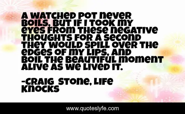 This page presents the quote "A watched pot never boils, but if I took my eyes from these negative thoughts for a second they would spill over the edges of my lips, and boil the beautiful moment alive as we lived it.". Author of this quote is Craig Stone, Life Knocks. This quote is about jealousy, love, affection,.