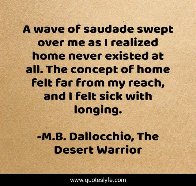 This page presents the quote "A wave of saudade swept over me as I realized home never existed at all. The concept of home felt far from my reach, and I felt sick with longing.". Author of this quote is M.B. Dallocchio, The Desert Warrior. This quote is about wanderlust, saudade, escapism, ptsd, trauma, home, war,.