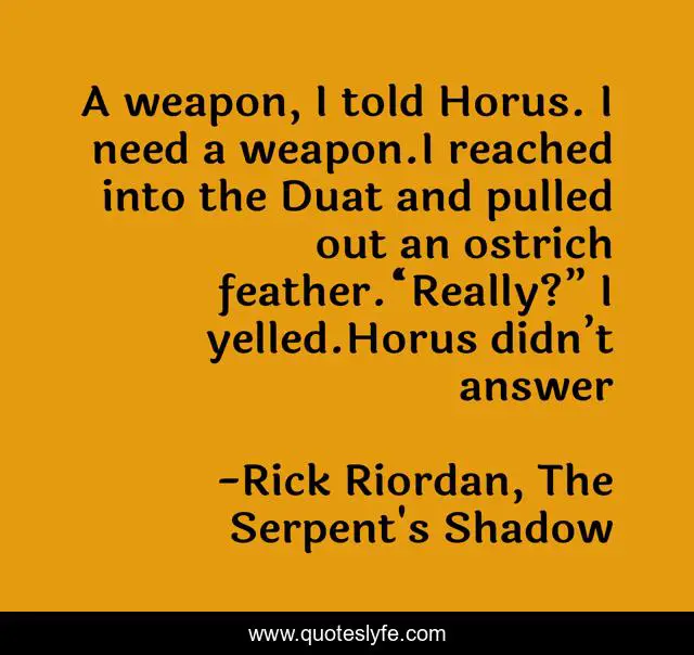 This page presents the quote "A weapon, I told Horus. I need a weapon.I reached into the Duat and pulled out an ostrich feather.“Really?” I yelled.Horus didn’t answer". Author of this quote is Rick Riordan, The Serpent's Shadow. .