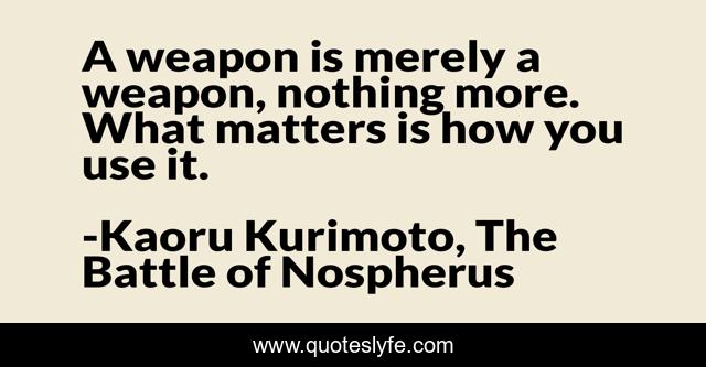 This page presents the quote "A weapon is merely a weapon, nothing more. What matters is how you use it.". Author of this quote is Kaoru Kurimoto, The Battle of Nospherus. This quote is about light-novel, weapon, kaoru-kurimoto, the-guin-saga, general, count-marus, lady-amnelis, battle, strategy,.