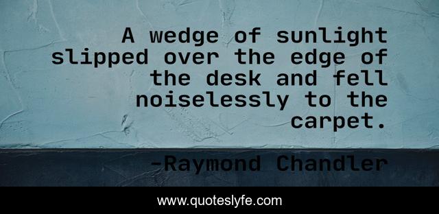 This page presents the quote "A wedge of sunlight slipped over the edge of the desk and fell noiselessly to the carpet.". Author of this quote is Raymond Chandler. This quote is about mystery, film-noir, crime,.