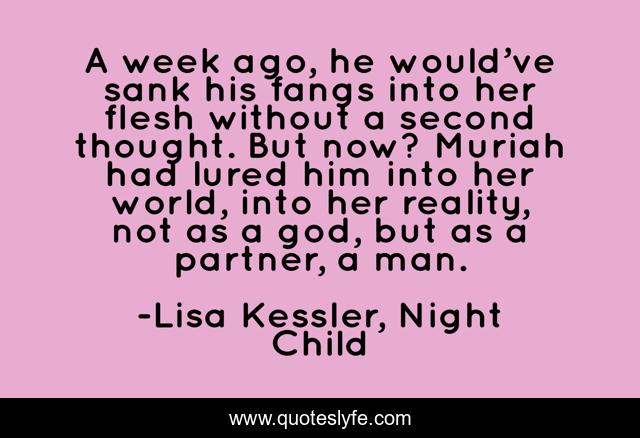 This page presents the quote "A week ago, he would’ve sank his fangs into her flesh without a second thought. But now? Muriah had lured him into her world, into her reality, not as a god, but as a partner, a man.". Author of this quote is Lisa Kessler, Night Child. This quote is about night-series, romance, vampire,.