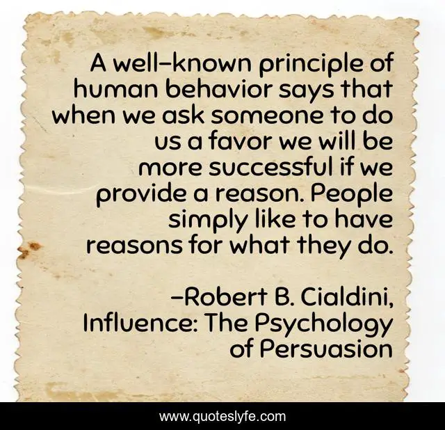 This page presents the quote "A well-known principle of human behavior says that when we ask someone to do us a favor we will be more successful if we provide a reason. People simply like to have reasons for what they do.". Author of this quote is Robert B. Cialdini, Influence: The Psychology of Persuasion. .