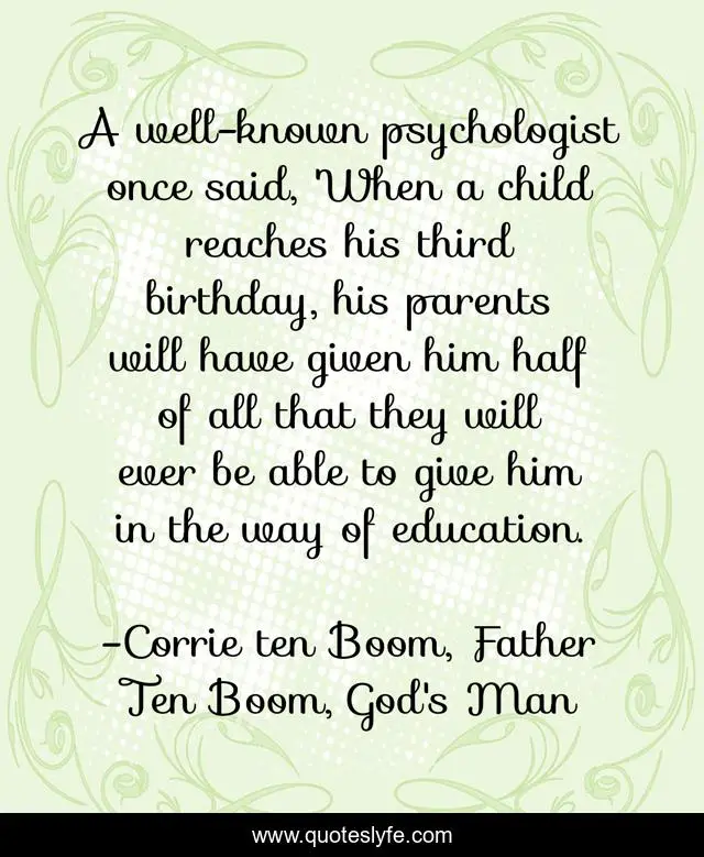 This page presents the quote "A well-known psychologist once said, 'When a child reaches his third birthday, his parents will have given him half of all that they will ever be able to give him in the way of education.". Author of this quote is Corrie ten Boom, Father Ten Boom, God's Man. This quote is about development, psychology, parent, children, parenting, child, education, childhood,.