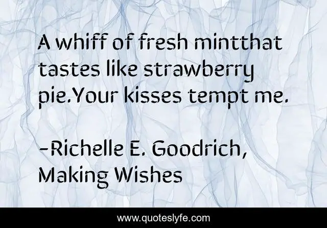 This page presents the quote "A whiff of fresh mintthat tastes like strawberry pie.Your kisses tempt me.". Author of this quote is Richelle E. Goodrich, Making Wishes. This quote is about love, richelle-e-goodrich, kisses, poetry, richelle, haiku, richelle-goodrich, affection, kissing,.