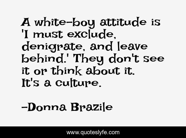 This page presents the quote "A white-boy attitude is 'I must exclude, denigrate, and leave behind.' They don't see it or think about it. It's a culture.". Author of this quote is Donna Brazile. This quote is about culture, see, think,.