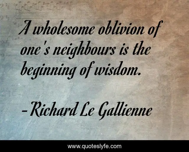 This page presents the quote "A wholesome oblivion of one's neighbours is the beginning of wisdom.". Author of this quote is Richard Le Gallienne. This quote is about neighbours, beginning,.