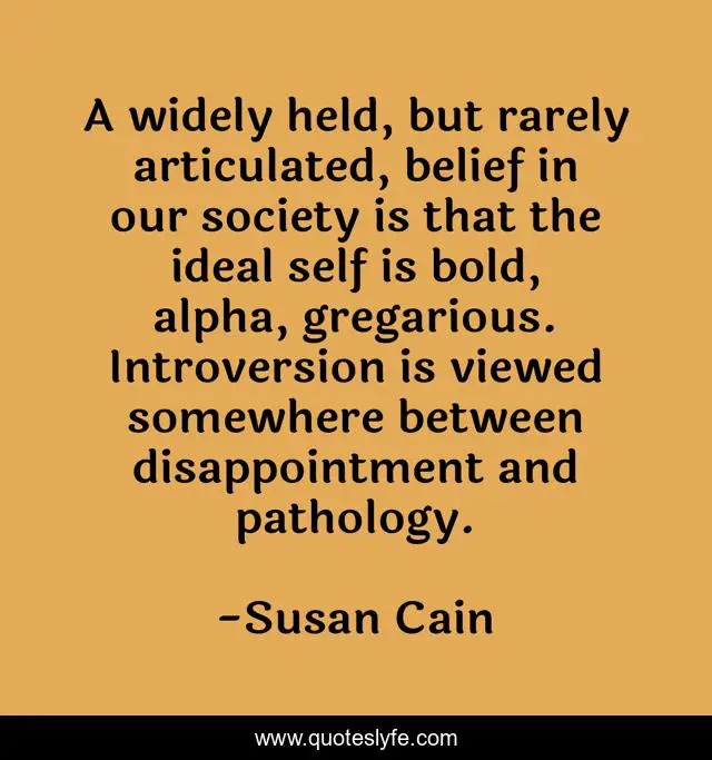 This page presents the quote "A widely held, but rarely articulated, belief in our society is that the ideal self is bold, alpha, gregarious. Introversion is viewed somewhere between disappointment and pathology.". Author of this quote is Susan Cain. This quote is about self, disappointment, belief,.