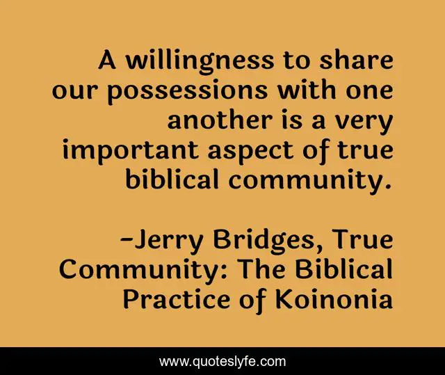 This page presents the quote "A willingness to share our possessions with one another is a very important aspect of true biblical community.". Author of this quote is Jerry Bridges, True Community: The Biblical Practice of Koinonia. This quote is about biblical-community, koinonia, share, community,.