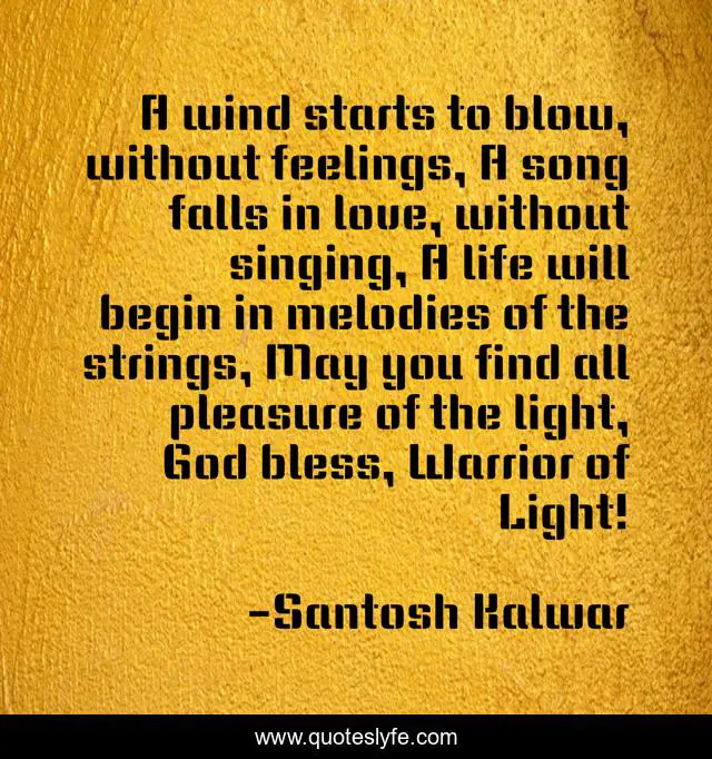 This page presents the quote "A wind starts to blow, without feelings, A song falls in love, without singing, A life will begin in melodies of the strings, May you find all pleasure of the light, God bless, Warrior of Light!". Author of this quote is Santosh Kalwar. .
