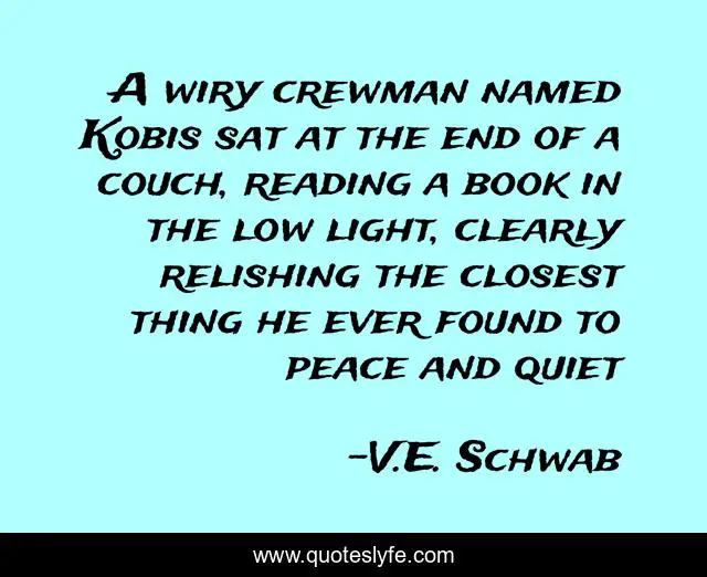 This page presents the quote "A wiry crewman named Kobis sat at the end of a couch, reading a book in the low light, clearly relishing the closest thing he ever found to peace and quiet". Author of this quote is V.E. Schwab. This quote is about a-gathering-of-shadows, book,.