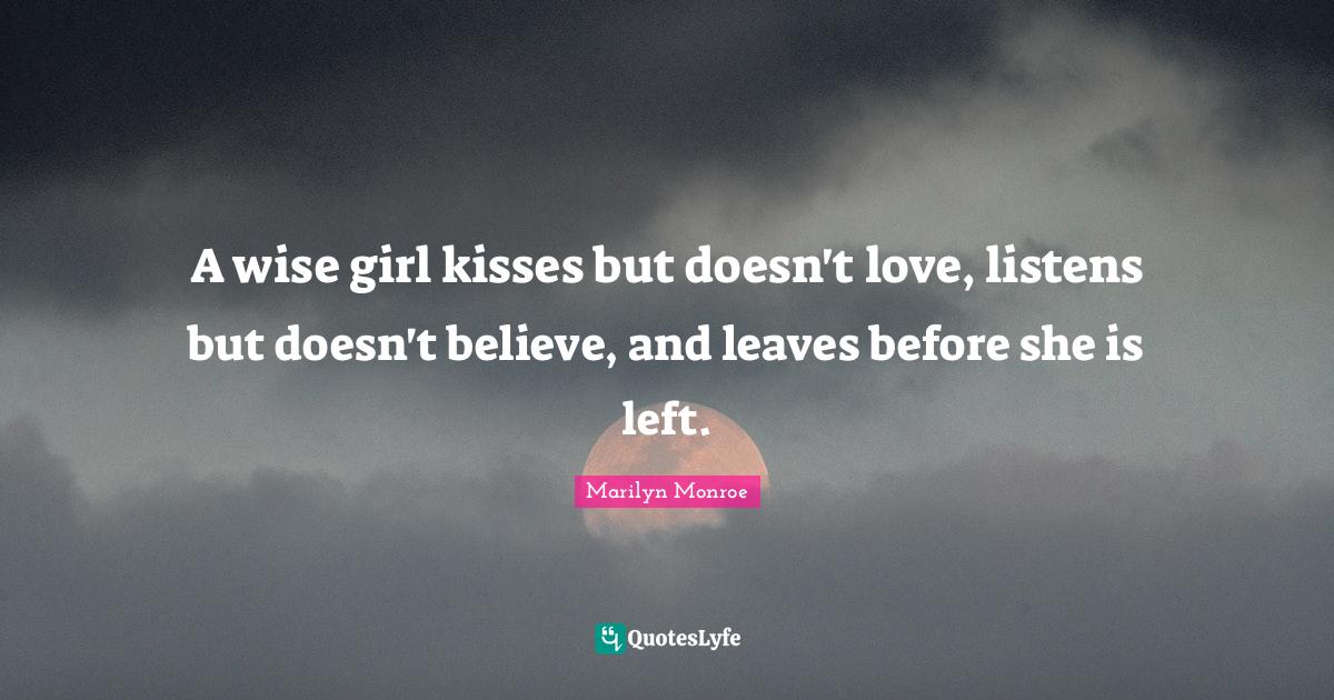 This page presents the quote "A wise girl kisses but doesn't love, listens but doesn't believe, and leaves before she is left.". Author of this quote is Marilyn Monroe. This quote is about love, left, anniversary, sad, believe, wise girl,.