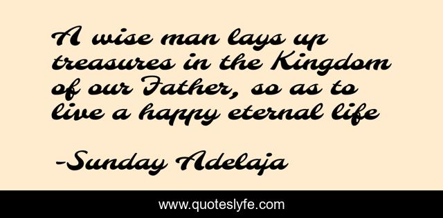 This page presents the quote "A wise man lays up treasures in the Kingdom of our Father, so as to live a happy eternal life". Author of this quote is Sunday Adelaja. This quote is about kingdom, eternal, treasures, father, wise,.