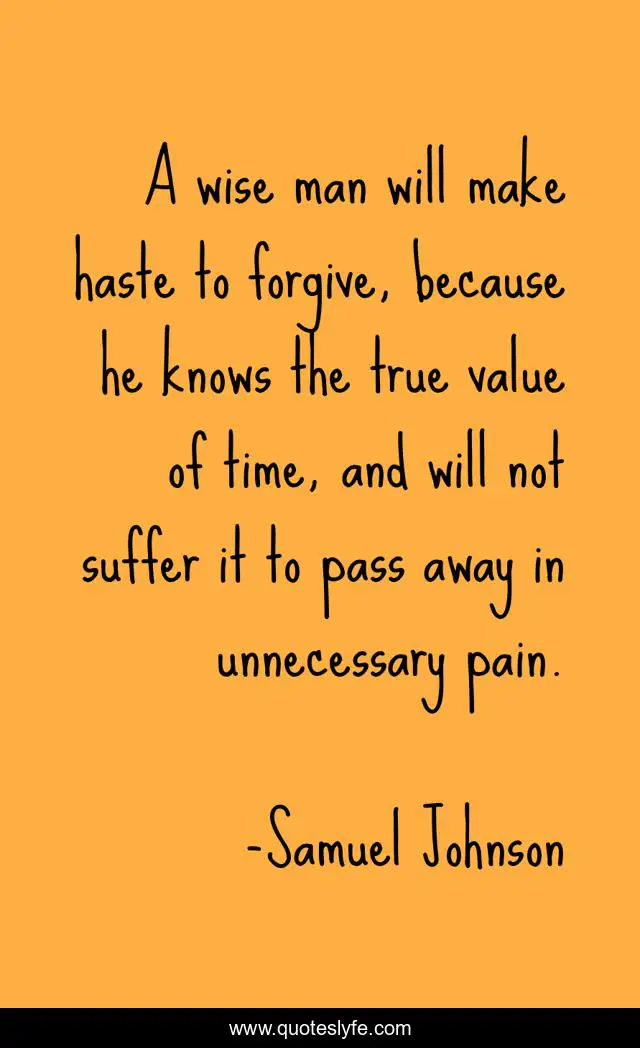 This page presents the quote "A wise man will make haste to forgive, because he knows the true value of time, and will not suffer it to pass away in unnecessary pain.". Author of this quote is Samuel Johnson. This quote is about samuel-johnson, forgive,.