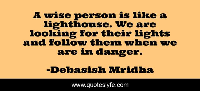 This page presents the quote "A wise person is like a lighthouse. We are looking for their lights and follow them when we are in danger.". Author of this quote is Debasish Mridha. This quote is about philosophy, debasish-mridha, a-wise-person, quotes, debasish-mridha-md, inspirational, safety-of-a-lighthouse, a-person-is-like-a-lighthouse, enthusiasm,.