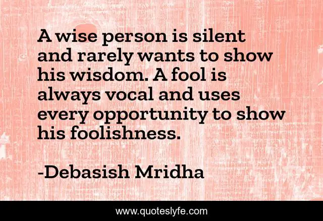 This page presents the quote "A wise person is silent and rarely wants to show his wisdom. A fool is always vocal and uses every opportunity to show his foolishness.". Author of this quote is Debasish Mridha. This quote is about wise-person, philosophy, debasish-mridha, foolishness, wisdom, quotes, inspirational, enthusiasm, fools,.