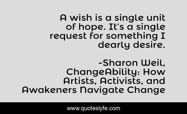 This page presents the quote "A wish is a single unit of hope. It’s a single request for something I dearly desire.". Author of this quote is Sharon Weil, ChangeAbility: How Artists, Activists, and Awakeners Navigate Change. This quote is about desire, changeability, wish, hope, hopeful, change, hopefulness, be-the-change, dreams,.