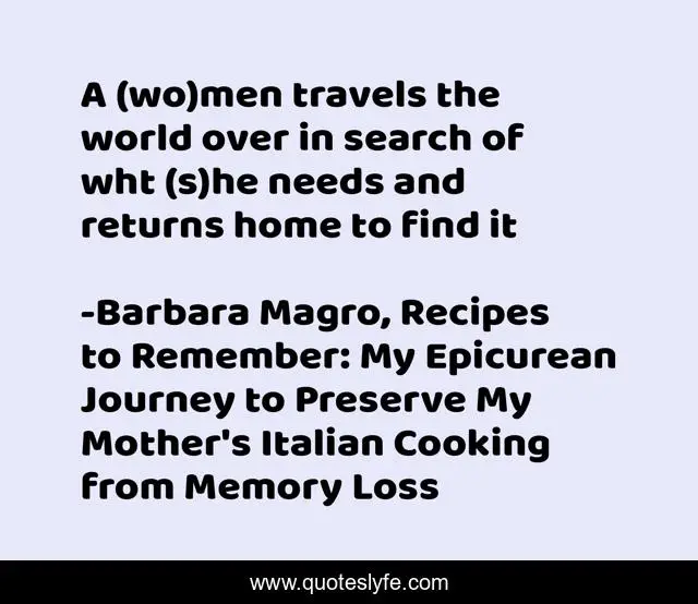 "Barbara Magro, Recipes to Remember: My Epicurean Journey to Preserve My Mother's Italian Cooking from Memory Loss Quotes." Quoteslyfe.com, 2025. Mon. 08 Dec. 2025. <https://www.quoteslyfe.com/quote/A-wo-men-travels-the-world-over-137604>.