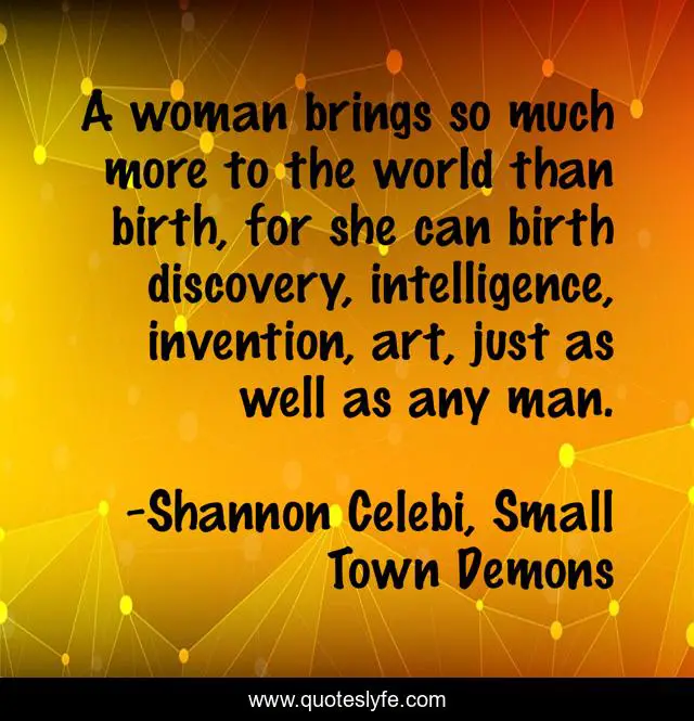 This page presents the quote "A woman brings so much more to the world than birth, for she can birth discovery, intelligence, invention, art, just as well as any man.". Author of this quote is Shannon Celebi, Small Town Demons. This quote is about art, woman-to-woman, intelligence, feminist, women-s-rights, woman-s-strength, invention, women-s-strength, birth,.