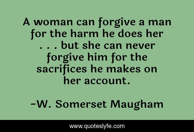 This page presents the quote "A woman can forgive a man for the harm he does her . . . but she can never forgive him for the sacrifices he makes on her account.". Author of this quote is W. Somerset Maugham. .